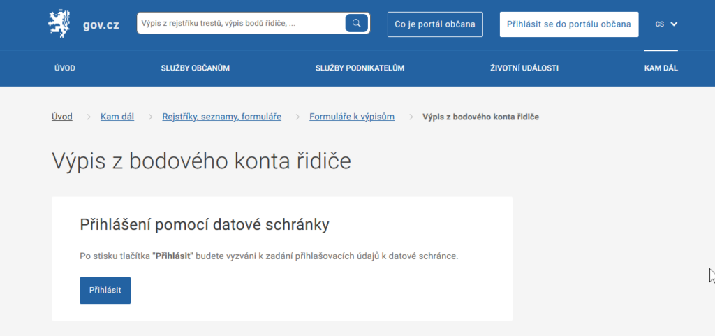 Portál občana → po přihlášení vyhledat „Bodové hodnocení řidiče“ → otevřít službu