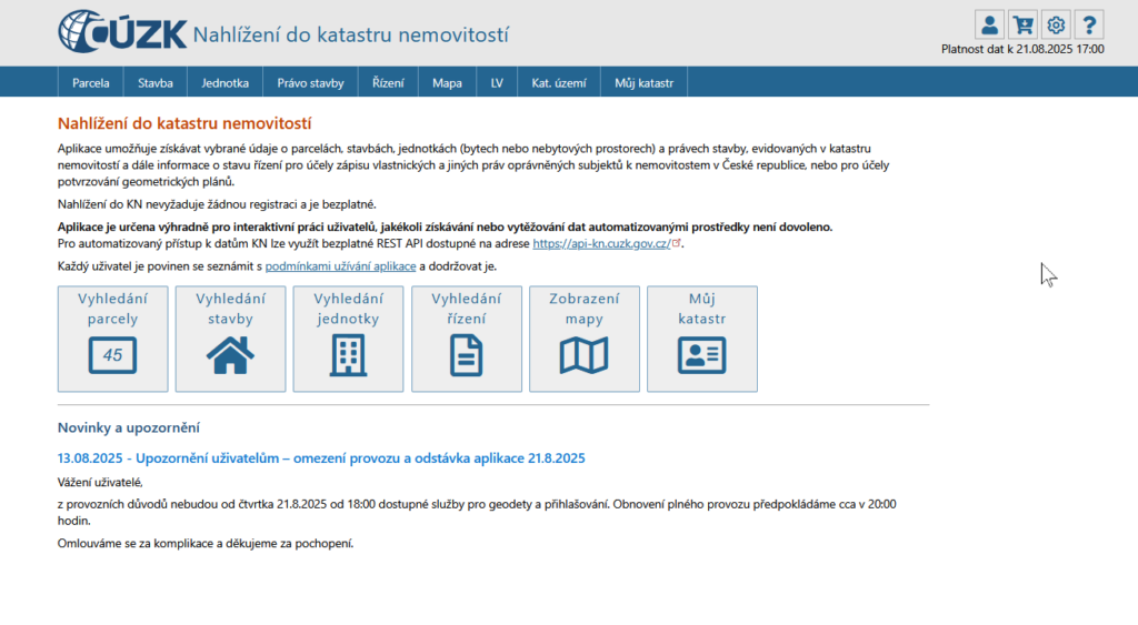 - Katastr nemovitostí (nahlížení) – adresa: nahlizenidokn.cuzk.cz