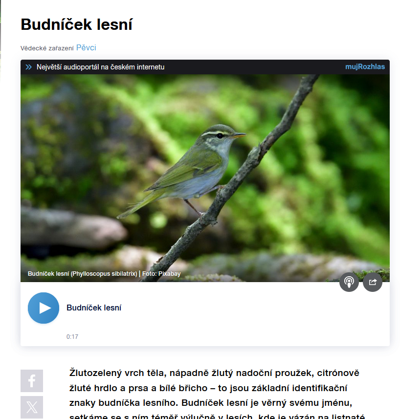 Mini-postup (příklad – zahrada): Merlin navrhl „sýkora koňadra“ i „sýkora modřinka“. V Atlasu si pustím hlasy obou druhů a všimnu si rozdílů v tónu a rytmu. Venku si pak cíleně vybírám ty „rysy“, které už poznávám. Nebo si prostě jen mohu přečíst další informace o druhu, který mně zajímá (například budníček lesníí):