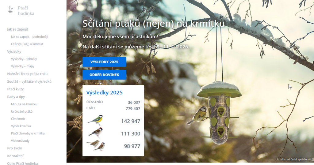 Co to je: Jednoduché občanské sčítání ptáků u krmítek: během 1 hodiny zapisujete nejvyšší současně viděný počet jedinců každého druhu. Součástí jsou materiály k poznávání nejběžnějších „krmítkových“ druhů, kvízy a hravé aktivity – skvělé pro společné učení s rodinou.