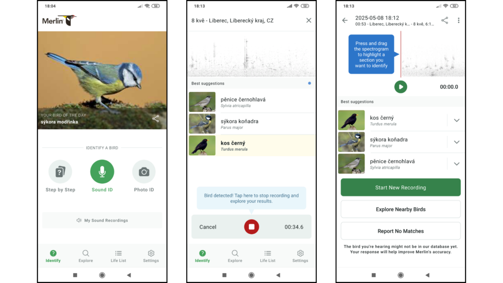 - Seznam druhů: průběžně se aktualizuje. Druh, který Merlin právě „slyší“, bývá zvýrazněn.