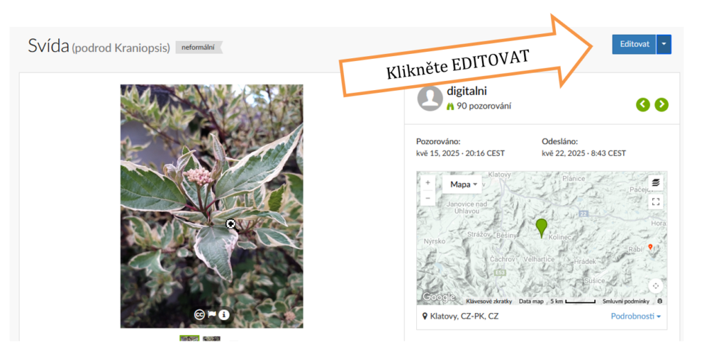 - Přesunout se k vlastním pozorováním na webu a otevřít jejich detail.