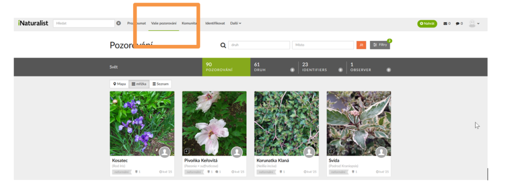 Po přihlášení na webu iNaturalist otevřete nabídku u svého účtu a zvolte přehled vlastních pozorování. Zobrazí se seznam záznamů s náhledy fotografií a základními údaji. Kliknutím na libovolné pozorování otevřete jeho detail.