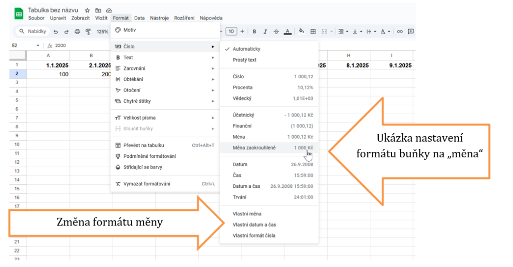 Také v Google Tabulkách můžete nastavit formát buněk jako datum, měna nebo text. Nastavujete v záložce FORMÁT / ČÍSLO. Následující obrázky nám uvedou několik příkladů, jak formátovat text, sami si můžete vyzkoušet třeba nastavit formátování měny, ale namísto Kč nastavte měnu EUR.