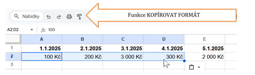 Stejně jako v MS WORD či MS Excel, má aplikace Google Tabulky vestavěnou funkci kopírování formátu. Jakmile tuto ikonu zapnete, stačí tímto „válečkem“ přetřít jakékoliv buňky v tabulce a přenese se do nich formát buňky, která byla aktivní při zapnutí funkce kopírování formátu.