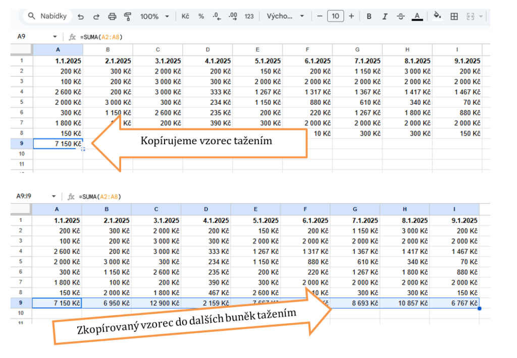 Nemusíte zapisovat každý vzorec zvlášť – jednou vytvořený vzorec můžete snadno zkopírovat do dalších buněk. Kopírování pomocí malého čtverečku v pravém dolním rohu buňky jsme si již ukázali. Pokud se v kopírované buňce nachází vzorec, tažením tohoto úchytu zkopírujete vzorec do dalších buněk. Postup: