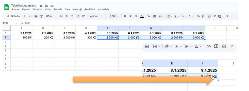 Další podobnost s MS Excel najdete v možnosti kopírovat obsah buněk tažením pomocí úchytu v pravém dolním rohu buňky (na rozdíl od Excelu, ale v Google Tabulkách uvidíte v rohu modrou tečku – jakmile na ni najedete kurzorem, změní se jeho tvar na křížek a nyní stačí kliknout levým tlačítkem myši, držet a táhnout přes všechny buňky, kam chcete kopírovat obsah buňky původní (například datumy, posloupnost čísel nebo třeba vzorec pro sumu).