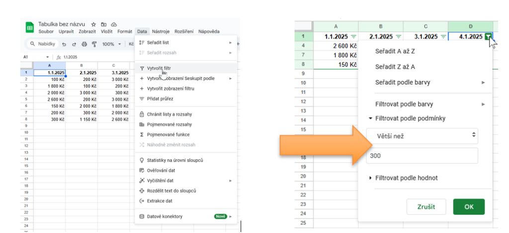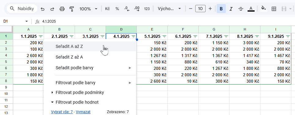 - Data → Vytvořit filtr (ikona trychtýře v liště)