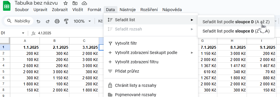 - Řazení: Data → Seřadit list podle sloupce A–Z / Z–A