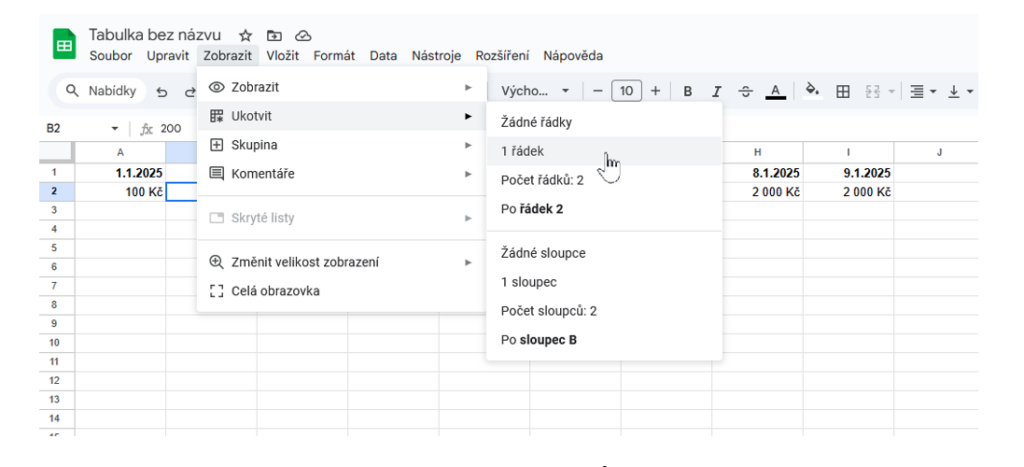 - Klikněte kamkoli do tabulky a otevřete Zobrazit → Ukotvit → 1 řádek.