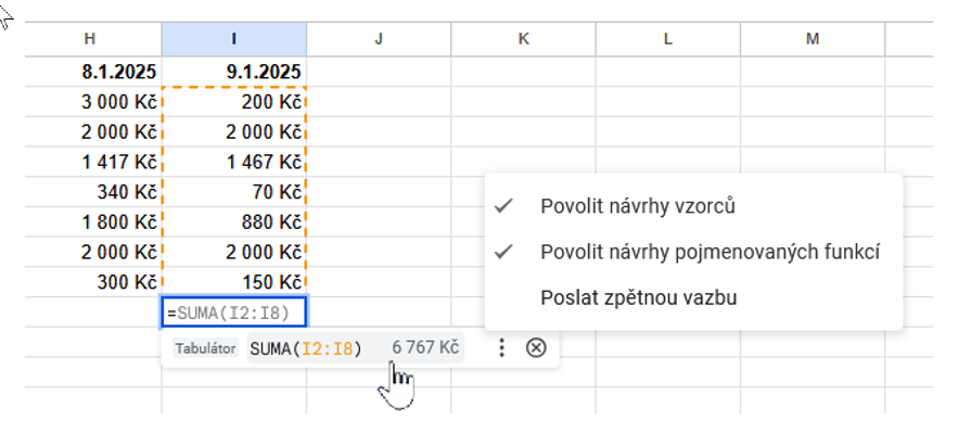 Pokud chcete sečíst nebo jinak vypočítat hodnoty, napište do buňky znak „rovná se“, zvolte funkci a označte rozsah. Stejně jako v Excelu se výsledek okamžitě přepočítá při změně vstupních údajů.