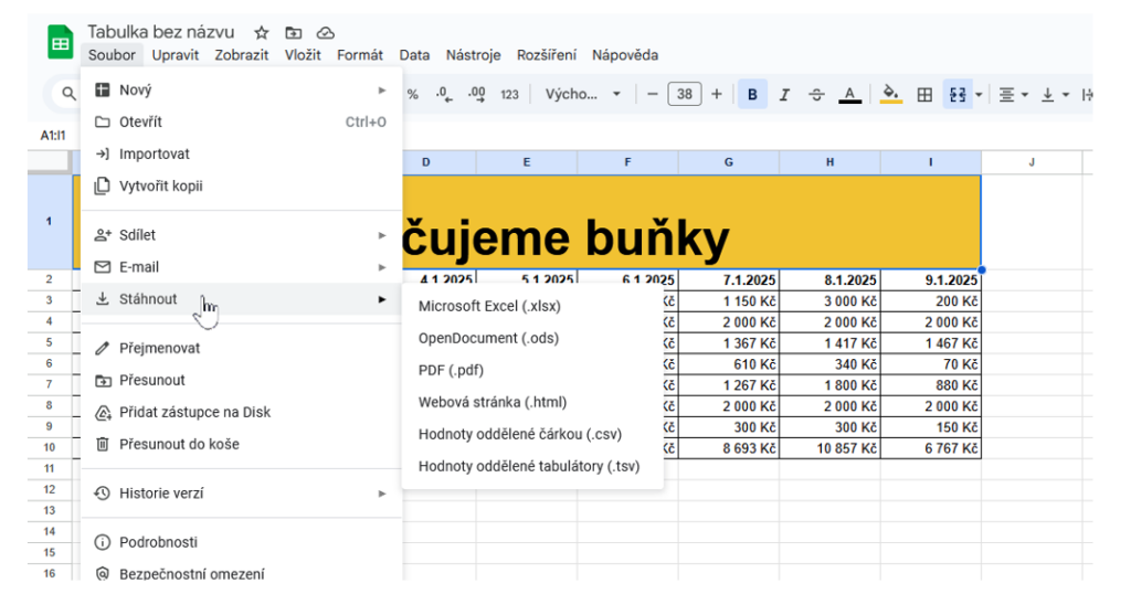 - Soubor → Stáhnout → Microsoft Excel (.xlsx)