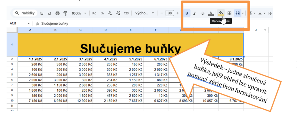 Slučování buněk používejte hlavně pro nadpisy nebo popisky nad tabulkou; uvnitř datové oblasti může komplikovat třídění, filtrování i export. Princip je i zde shodný s Excelem.