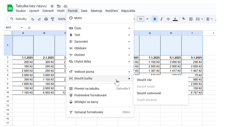 - V nabídce zvolte Formát → Sloučit buňky a vyberte typ: