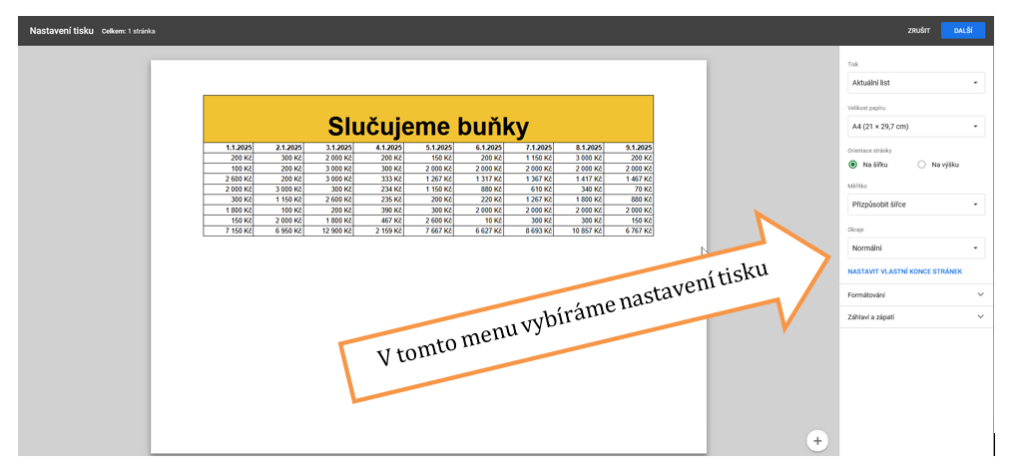 - Otevře se náhled tisku s nastaveními na pravé straně.