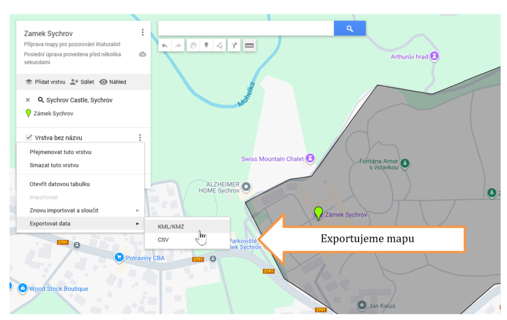 V My Maps exportujeme především kvůli dalšímu zpracování v jiných nástrojích nebo pro zálohu. Formátů exportu je víc, ale pro nás je zajímavý formát KML, protože ten následně vložíme do projektu iNaturalist.