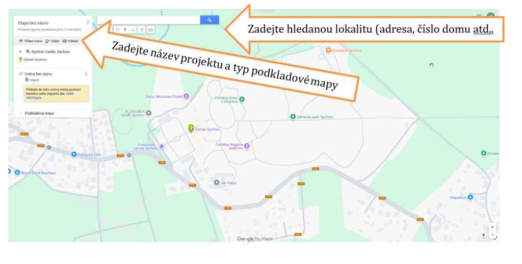 Vytvoření mapy v My Maps je velice jednoduché a intuitivní. Nejprve otevřete My Maps, zvolte Nová mapa, hned ji přejmenujte (název projektu) a zvolte podkladovou mapu (standard, terén, satelit).