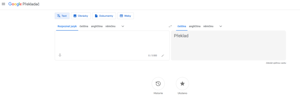 - Zvolte zdrojový jazyk (lze i automaticky rozpoznat) a cílový jazyk „čeština“.