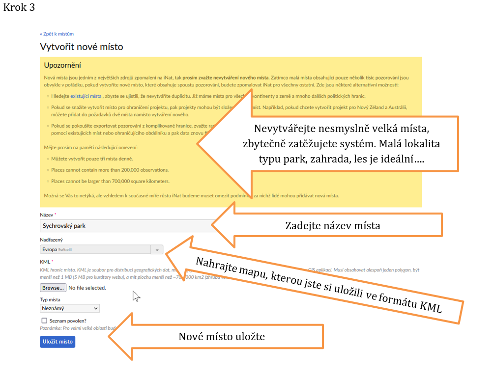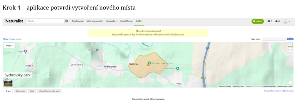 Než založíte projekt, je vhodné mít připravené vymezení lokality. Nejjednodušší je nakreslit hranici v Google My Maps (předchozí modul) a exportovat ji do souboru KML/KMZ. Tento soubor pak použijete v iNaturalist. Jakmile nahrajeme mapu své lokality (pokud místo v databázi iNaturalist neexistuje), můžeme založit nový projekt.