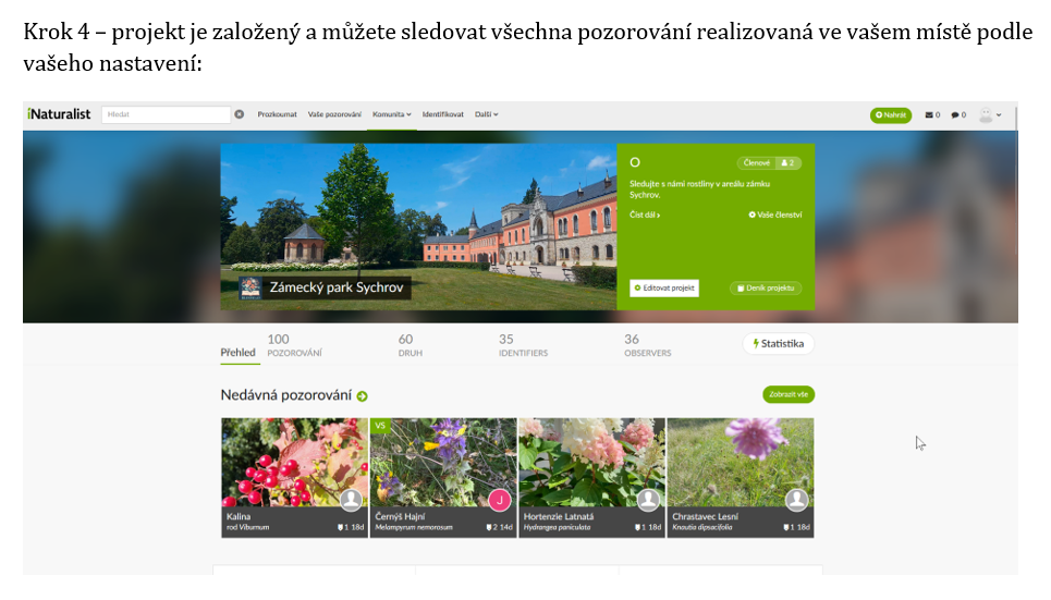 - Krok 3: Vyplňte název (např. „Zámecký park Sychrov – pozorování“) a stručný popis s cílem projektu; můžete uvést pravidla etiky a kontakt na koordinátora.