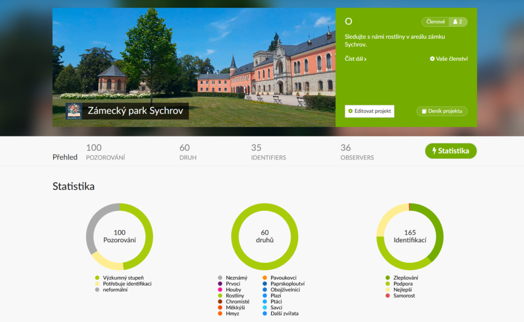 Ukázka toho, jak vypadá již hotový založený projekt Zámecký park Sychrov a jaká data se do něj sírají (i bez vašeho přičinění – kdokoliv v lokalitě provede pozorování, zaznamená se na vaší mapy lokality):