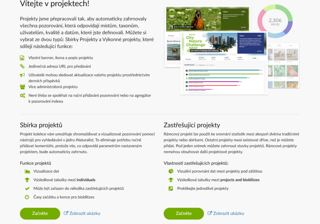 Otevře se stránka, kde najdete informace o tom, jak založit projekt a jaké typy projektů můžete vytvářet. My vytvříme sbírkový projekt (bude sbírat data pro naši konkrétní lokalitu, kterou jsme definovali mapou)