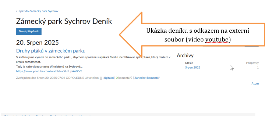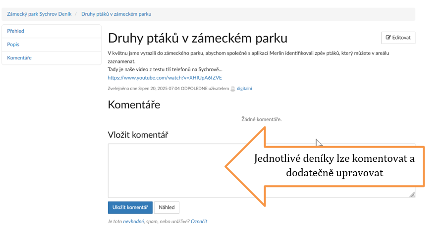 - Na stránce projektu zvolte Deník → Nový záznam (titulek, text, volitelné odkazy/obrázek).