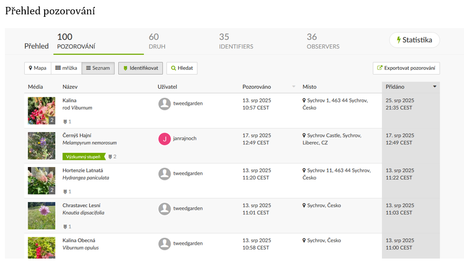 - Stránka projektu → Přehled (souhrny a grafy) a Pozorování (konkrétní záznamy a mapa).