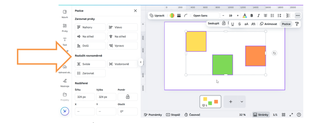 Než začnete se studiem této lekce, otevřete si modul prezentace v Canvě a vložte do pracovní plochy tři prvky, které chcete upravit. Pro společné operace budete pracovat s více objekty najednou (víceprvkový výběr) – budeme se učit, jak zajistit, aby úpravy zarovnání, rozestupů či vrstvení proběhly konzistentně v celém výběru.