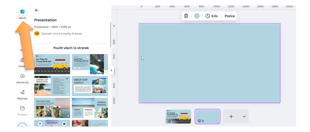 Otevřete v levém panelu zobrazení Návrh a zvolte Šablony (případně Nedávno použité). Klikněte na šablonu, se kterou pracujete – rozbalí se všechny stránky, které obsahuje. Máte dvě možnosti: