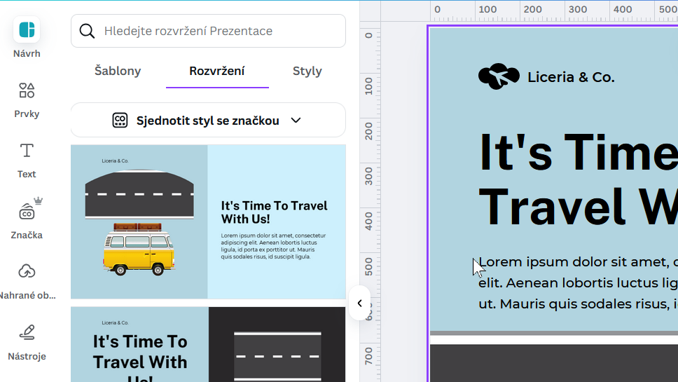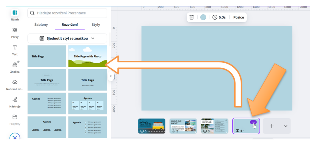 - Stránka ze šablony: Pokud máte vybranou stránku, která už pochází z nějaké šablony, Canva v Rozvržení nabídne stránky z této šablony. Snadno tak přepnete na jiný vzor ze stejné sady a zachováte vizuální jednotu (barvy, typografii, styl).