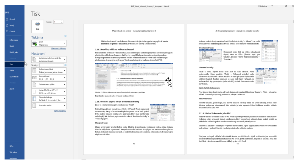 Ovládáte zobrazení Rozložení při tisku, nastavení okrajů, orientace a velikosti papíru, umíte vložit zalomení stránky, vyvolat náhled tisku a uložit dokument jako PDF. Tím je dokument připraven k bezpečnému sdílení i bez rizika změn rozvržení.