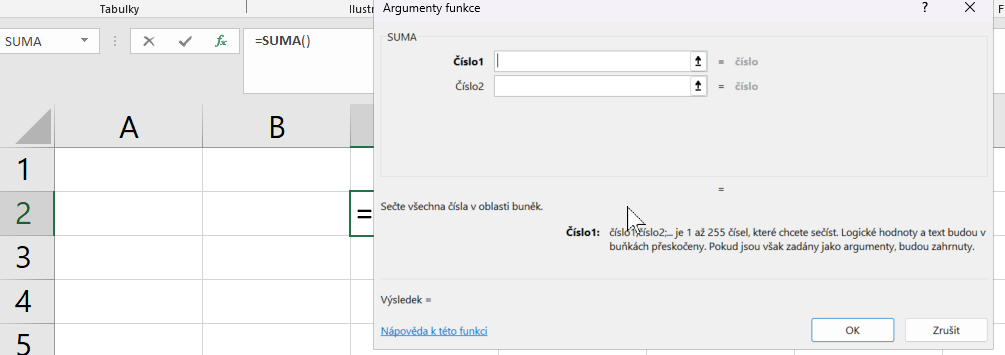 - SUMA(…): sečte zadané buňky či oblast. Příklad: =SUMA(B1:B3).