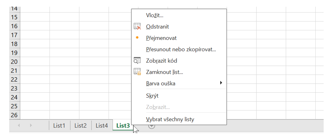 - Odstranění listu: pravým tlačítkem na záložku → Odstranit. Pozor – data z listu se smažou.