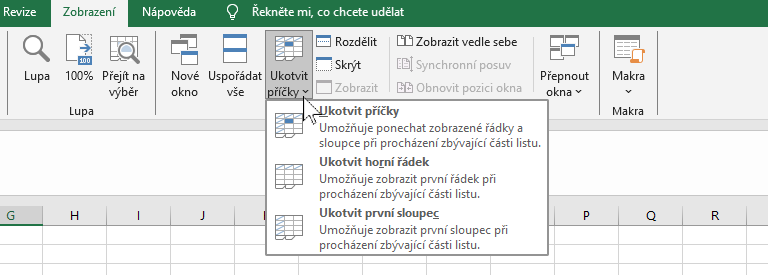 Tato funkce vám umožní zakotvit první řádek nebo sloupec (případně oba), ve kterých máte popisky data. Pohybem posuvníku pak posunujete poue data, popisky zůstávají zakotvené. Jak na to: