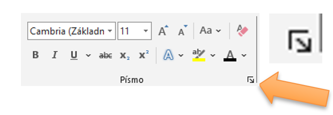 - Pro rozšířené volby klikněte na malou šipku v pravém dolním rohu skupiny Písmo (otevře podrobné okno).