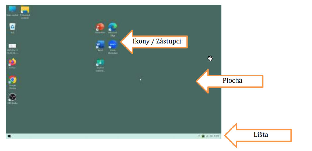 Plocha je „pracovní stůl“ s ikonami. Ikona může představovat program, soubor nebo zástupce (odkaz). Zástupce poznáte podle malé šipky na ikoně; smazáním zástupce nesmažete původní soubor/program.